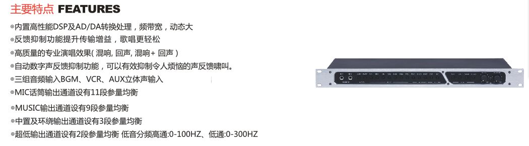 详细介绍:3.1声道输出,模拟前级放大器,带7段均衡话筒调节,内置反馈啸叫功能
